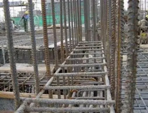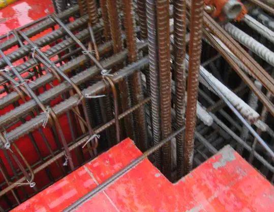 1)根据弹好的肋板(立柱)位置线,将肋板(立柱)伸入基础的插筋绑扎牢固,插入基础深度要符合设计要求,甩出长度不宜过长,其上端应采取措施保证甩筋垂直,不歪斜、倾倒、变位。