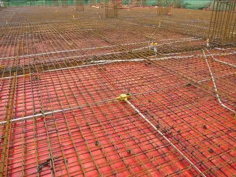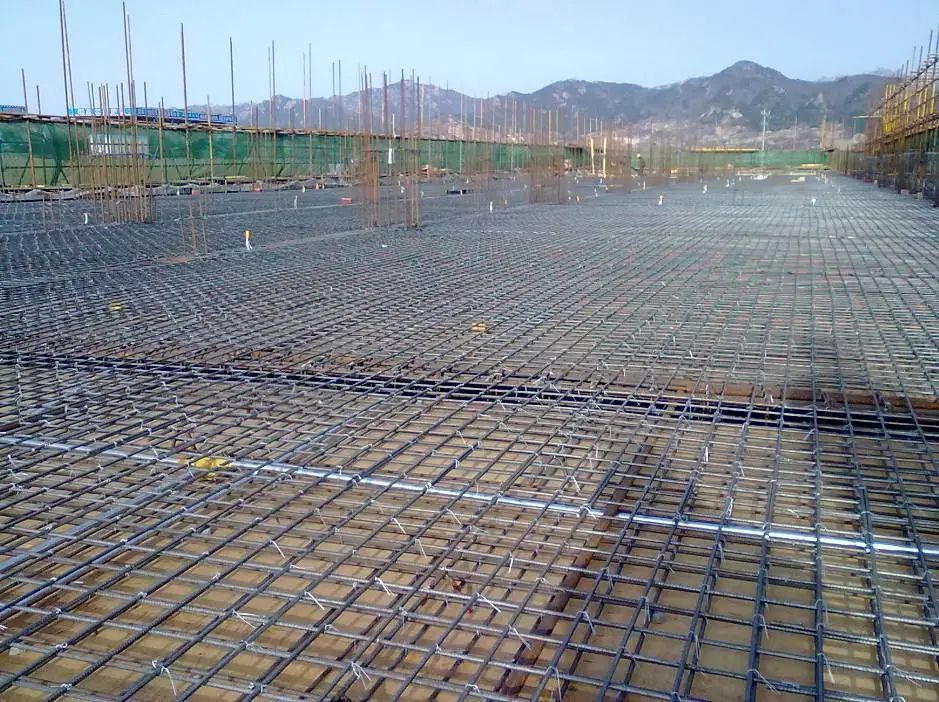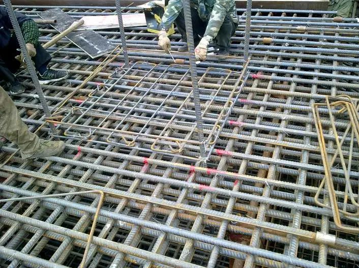 1)按弹出的钢筋位置线,先铺下层钢筋。根据底板受力情况,决定下层钢筋哪个方向钢筋在下面,一般情况下先铺短向钢筋,再铺长向钢筋。