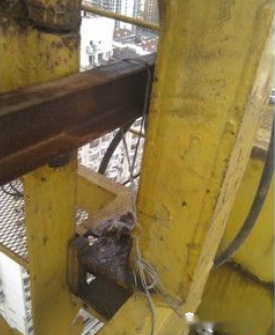 这样的情况造成另外三个销轴受力不均匀,可能发生塔吊倾覆事故。