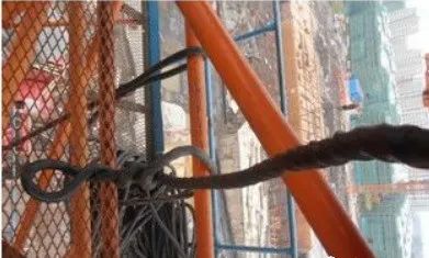 钢丝绳不允许折弯和打结容易发生钢丝绳断裂事故,如果吊钩吊重物的话有可能引起塔吊倾覆事故。