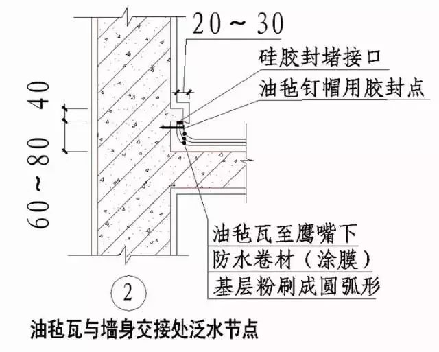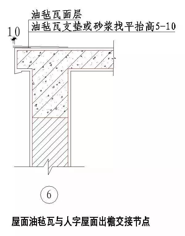 5)油毡瓦屋面与突出屋面部分交接处均应做泛水处理,可沿屋面坡度做通长挡水线,并在挡水线下做老鹰嘴(见图2),油毡瓦屋面与突出屋面管道交接处做法(见图3)。