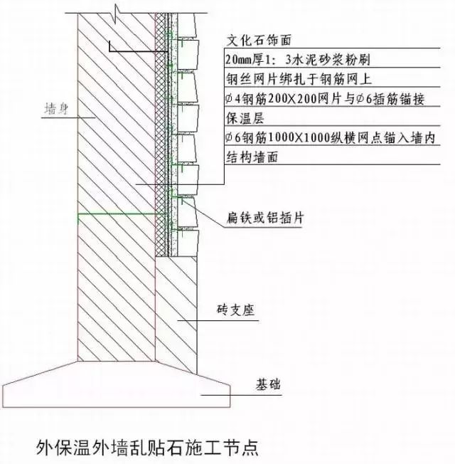 3)文化石饰面高度超过一层时,在二层圈梁部位增设一道钢筋混凝土支座线,如有饰面要求,可选用暗设方案施工。