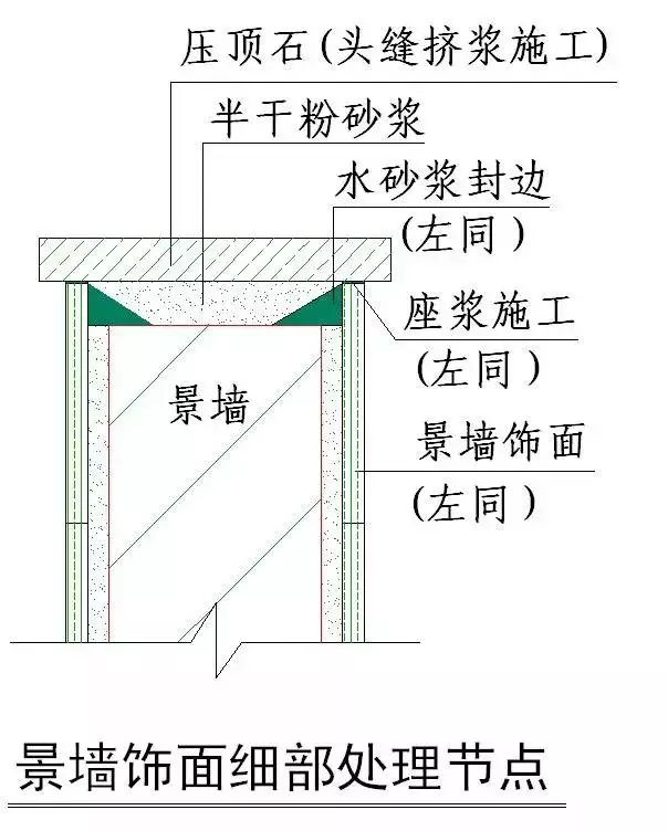 注:线脚压顶板与墙体之间预留10-15mm,施工时,压顶板从外向墙根方向挤压施工,使水砂浆从该预留缝中挤出,未饱满处用原浆灌实,压顶板定位后,将挤出砂浆清理。