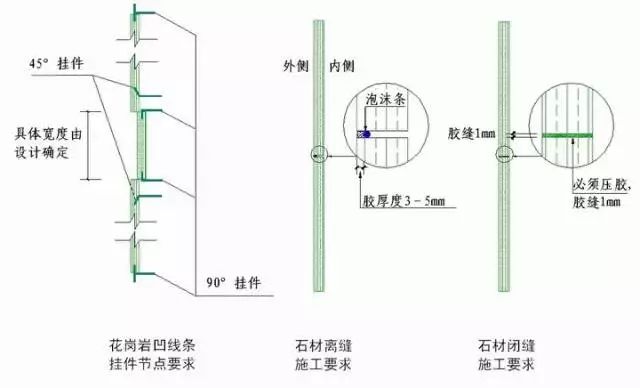 3)石材墙面设计要求打明胶时,板缝开三角槽缝或开小凹槽施工。