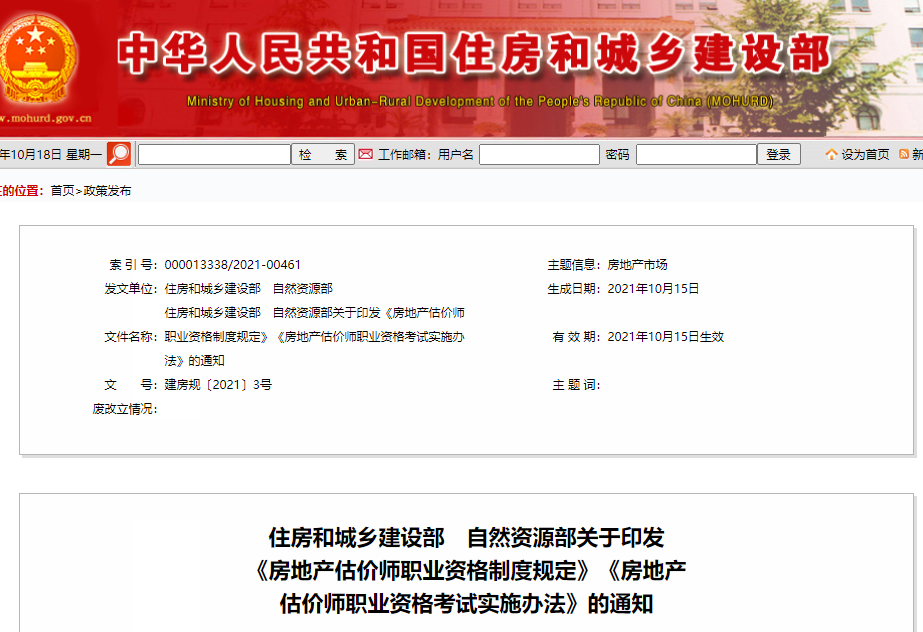 刚刚,住建部正式发布关于印发《房地产估价师职业资格制度规定》《房地产估价师职业资格考试实施办法》的通知,本规定自印发之日起施行。