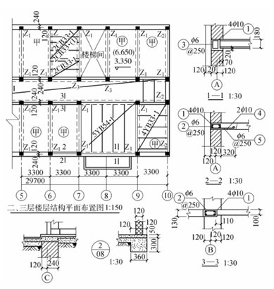 预制楼层结构平面图主要表示楼层各种预制构件的名称、编号、相对位置、定位尺寸及其与墙体的关系等。如图1-2中虚线表示不可见的构件、墙或梁的轮廓线,此房屋为砖墙承重、钢筋混凝土梁板的混合结构,除楼梯间外,各房间的板均为预制空心板,从图中可知板的类型、尺寸及数量。所用楼板为三种,分别为YB54·1,YB33·1,CB33·(1),数量如图所示,代号为甲的房间所用楼板为4YB33·1。二、三层楼板的结构标高为3.350m和6.650m。另外,给出的1-1、2-2、3-3剖面图表明了梁、板、墙、圈梁之间的关系。