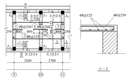 现浇楼层结构平面图主要标注轴线号、轴线尺寸、梁的位置和编号、板的厚度和标高及配筋情况。如图1-3所示,现浇板的上皮标高为3.720m,主筋为双向布置f8@125,构造分布筋为f8@200。