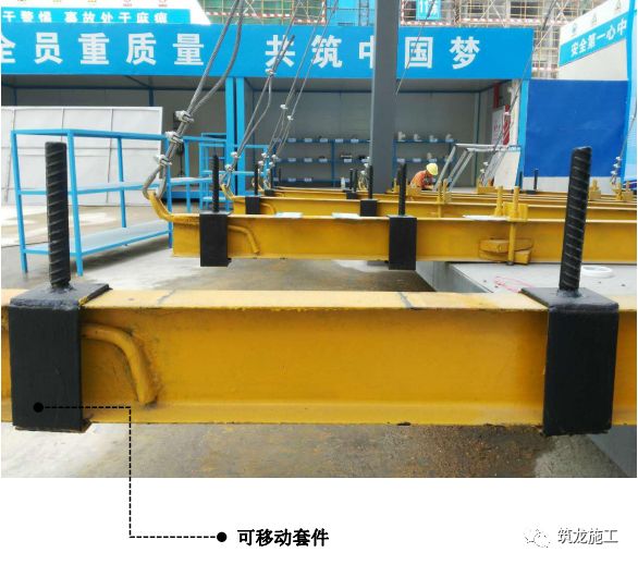 在型钢上增设可移动立杆套件,便于安装和调节立杆间距,避免定位筋在钢梁焊接时损伤型钢。