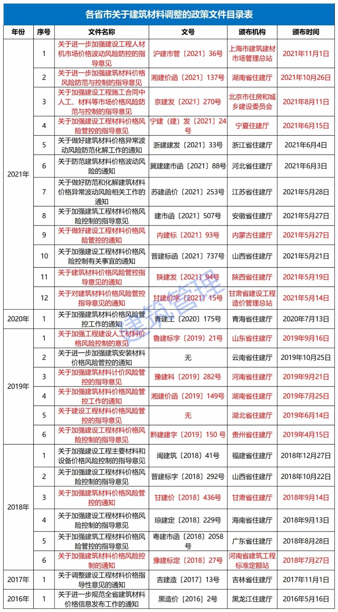 近期,建筑材料市场价格波动较大,对建设工程造成较大影响。上海、湖南、北京、宁夏、内蒙古、陕西、甘肃、江苏、河南、山东、湖北、贵州等多省市(下图中标红省市文件)发文明确: