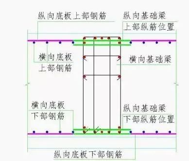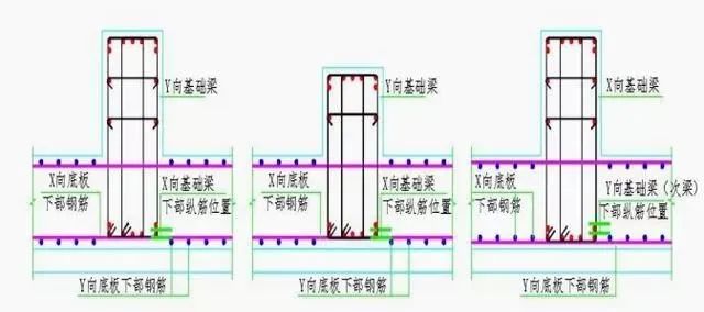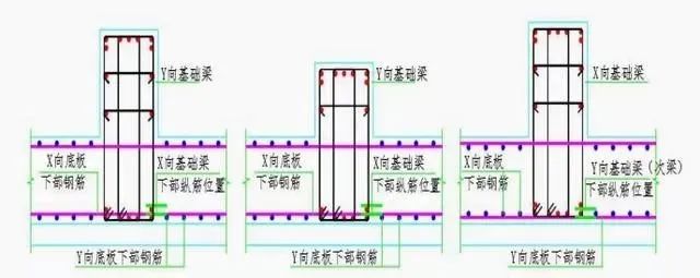 注意:施工高板位筏板时,梁钢筋与筏板下层钢筋以及梁与梁钢筋之间的位置关系。按图 9-7、图 9-8、图 9-9、图 9-10 所示绑扎。
