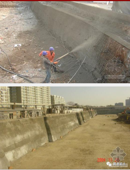 喷射砼可根据地层情况“先锚后喷”或“先喷后锚”,喷射作业时空压机风量不宜小于9m3/min,气压不小于0.5Mpa。喷头水压不应小于0.15 Mpa,喷射距离控制在0.8~1.5m,通过外加速凝剂控制砼初凝和终凝时间在5~10 min,喷射厚度不低于设计厚度。混凝 土配比严格按照设计要求进行。当面层厚度超过100mm时,应分二次喷射,每次喷射厚度宜为50~70mm。