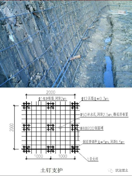 2、土钉必须和面层有效连接,应设置承压板或加强钢筋等构造措施,承压板或加强钢筋应与土钉螺栓连接或钢筋焊接连接;3、土钉的长度宜为开挖深度的0.5~1.2倍,间距宜为1~2m,与水平面夹角宜为5°~20 °;4、土钉钢筋宜采用HPB235、HPB335钢筋,钢筋直径宜为16 ~32mm,钻孔直径宜为70 ~120mm;5、注浆材料宜采用水泥浆或水泥砂浆,其强度等级不宜低于M10;6、喷射混凝土面层宜配置钢筋网片,钢筋直径宜为6 ~10mm,间距宜为150 ~300mm,喷射混凝土强度等级不宜低于C20,面层厚度不宜小于80mm;