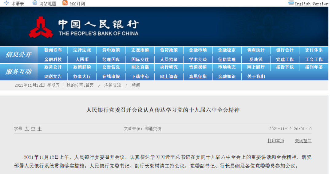 2021年11月12日上午,人民银行党委召开会议,认真传达学习习近平总书记在党的十九届六中全会上的重要讲话和全会精神,研究部署人民银行系统贯彻落实措施。人民银行党委书记、副行长郭树清主持会议,党委副书记、行长易纲及各位党委委员参加会议。会议强调,坚决遏制金融服务业领域的垄断和资本无序扩张,维护房地产市场平稳健康发展。
