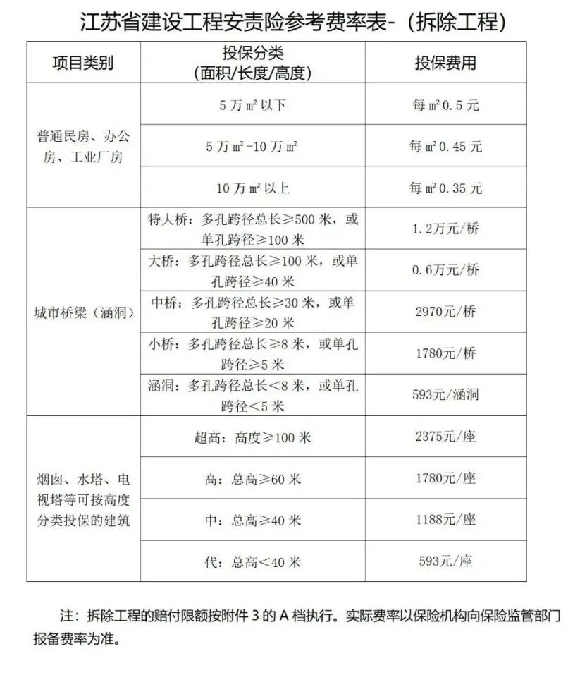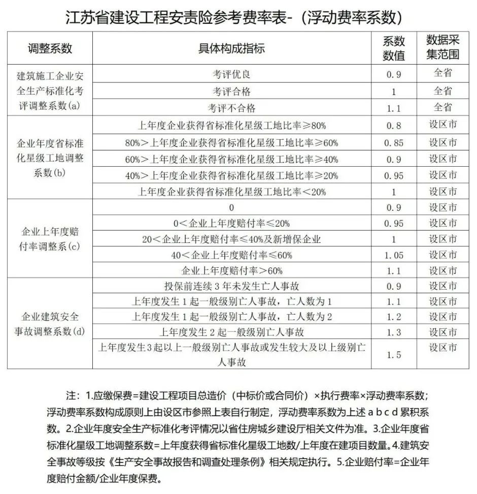 建设工程安责险的保费计算基数为建设工程项目的合同总造价(拆除工程除外),费率采用动态调整机制,分为基准费率和浮动费率系数,费率调整根据保险责任限额、建设工程类别、风险程度和施工企业安全生产标准化、事故记录等综合因素确定,并定期调整。(参考标准详见附件2《江苏省建设工程安责险参考费率表》)