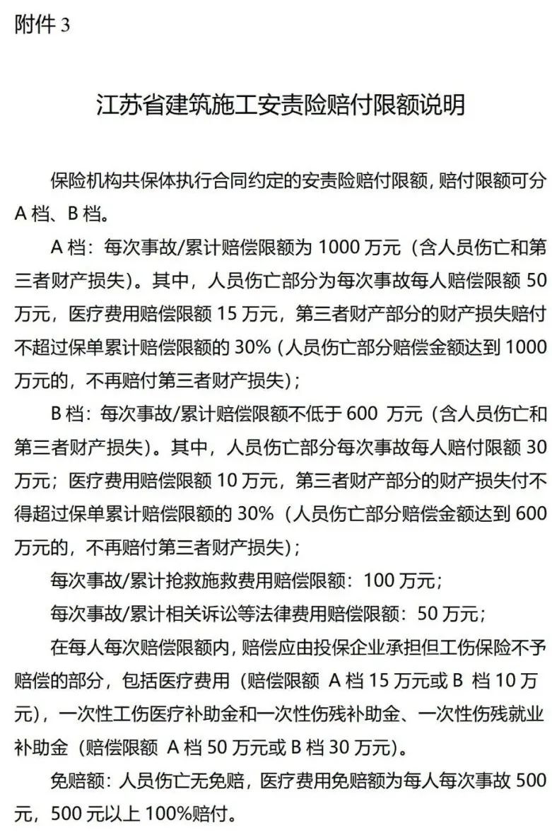 保险责任限额应当至少包括人员伤亡和第三者财产损失、事故抢险救援、医疗救护、法律诉讼费用等部分。本意见提出A、B两档赔付限额方案供参考(详见附件3《江苏省建筑施工安责险赔付限额说明》),各设区市建设主管部门可选择执行一档赔付限额或两档赔付限额方案。在运行一定周期后(建议三年),可结合建设工程的风险程度、工程造价和赔付情况适当提高赔付限额,并根据本市城镇居民年度人均可支配收入的变化适时调整。