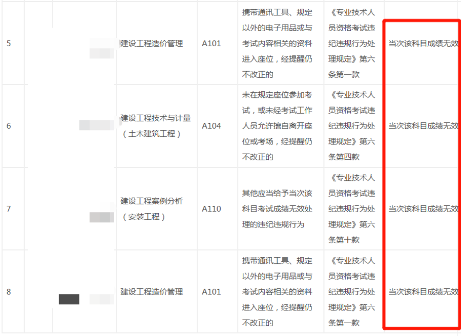 | 6 | 3330*** | 建设工程计价 | 考试中携带手机进入座位 | 当次该科目成绩无效处理 |