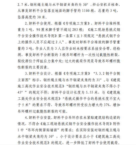 卸料平台钢丝绳主绳与水平钢梁夹角过小、吊环未紧贴建筑结构边梁、悬挑长度略大等设计、安装不符合有关规定的情况导致卸料平台实际承载能力降低,是吊环螺杆断裂的次要因素;