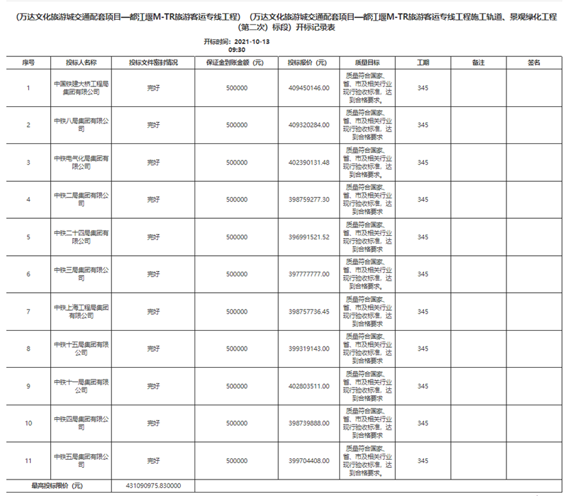2021年10月14日,万达文化旅游城交通配套项目—都江堰M-TR旅游客运专线工程施工轨道、景观绿化工程(第二次)标段流标公示。