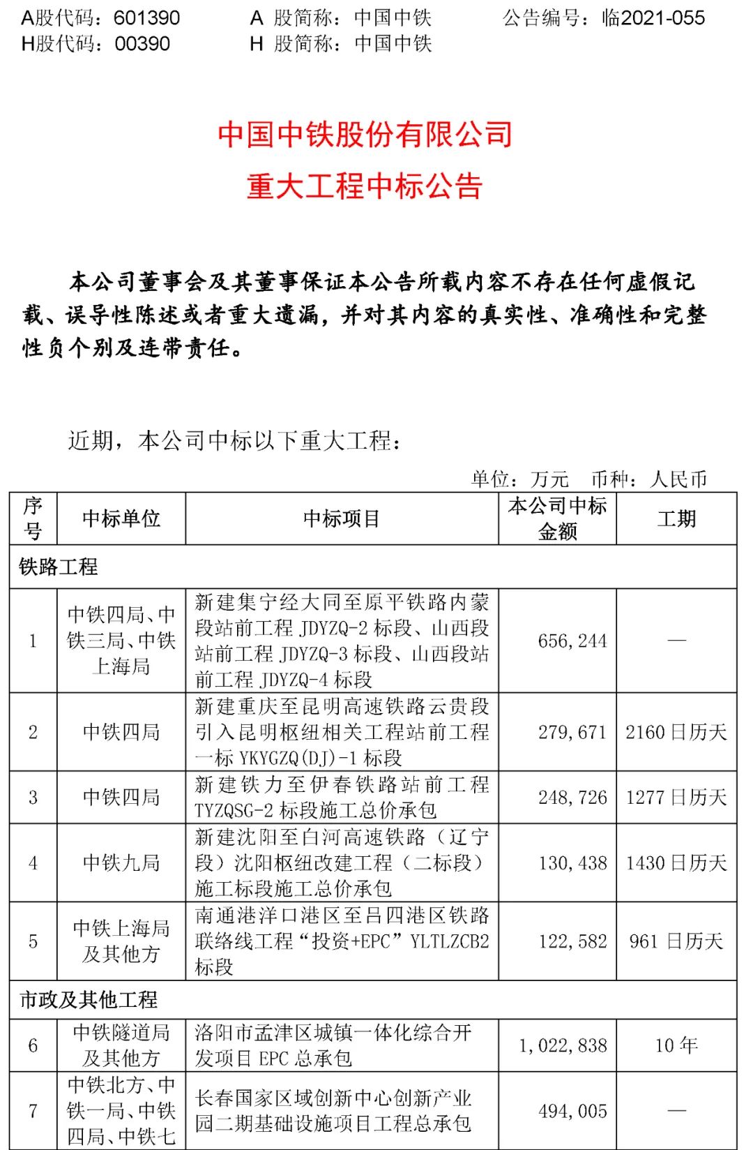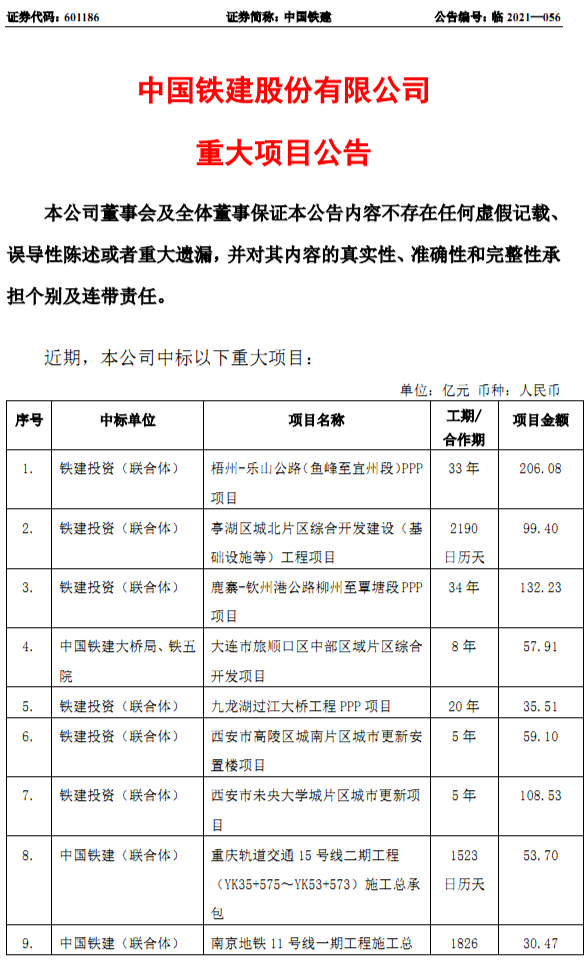 中国铁建公告,近期公司中标11个重大项目,项目金额合计987.21亿元,占公司2020年度经审计营业收入10.84%。