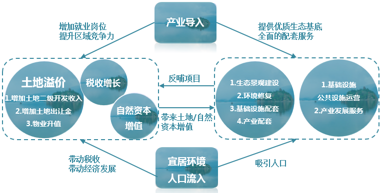 总结来说,EOD项目操作模式就是通过生态网络建设、环境修复、基础设施配套以及产业配套建设促使该区域及周边的土地升值,并为产业引入和人口流入提供良好的生态基底;一方面以产业发展增加居民收入、企业的利润和政府的税收;另一方面依靠人口流入带来政府税收的增加及区域经济的发展。最终实现生态建设、经济发展、社会生活三者协调发展。