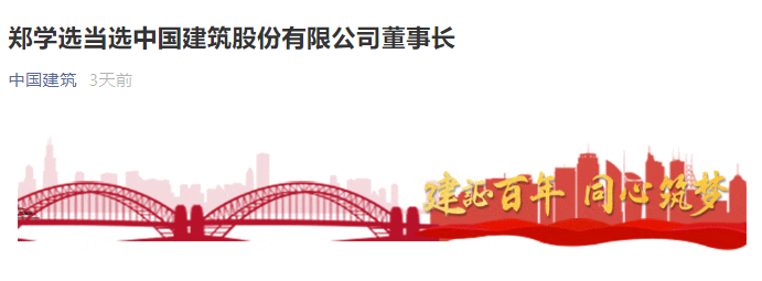 郑学选在当选后表示,中国建筑作为整体上市的公众公司,处在改革发展前沿,具有十分重要的地位。担任中国建筑董事长责任重大、使命光荣,未来将履职尽责、不负重托,和广大干部员工共同努力,以习近平新时代中国特色社会主义思想为指导,深入贯彻落实党中央、国务院决策部署,按照国务院国资委工作要求,聚焦“一创五强”战略目标,以勇于担当的责任感、时不我待的紧迫感,加快建设具有全球竞争力的世界一流企业,推动公司实现高质量发展。