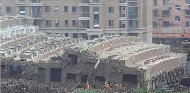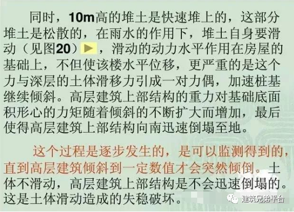 紧贴7号楼北侧,在短时间内堆土过高,最高处达10米左右;与此同时,紧邻7号楼南侧的地下车库基坑正在开挖,开挖深度4.6米,大楼两侧的压力差使土体产生水平位移,过大的水平力超过了桩基的抗侧能力,导致房屋倾倒。