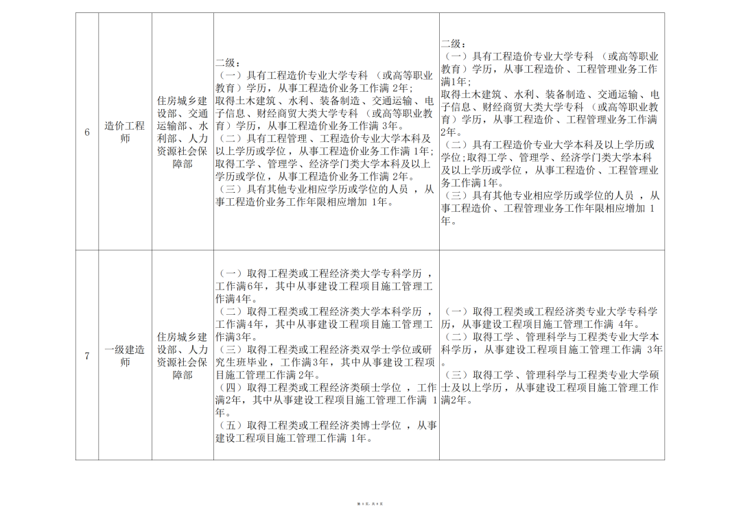 (二)具有通过工程教育专业评估(认证)的工程管理、工程造价专业大学本科学历或学位,从事工程造价业务工作满4年;具有工学类、管理学类、经济学门类大学本科学历或学位,从事工程造价业务工作满5年。
