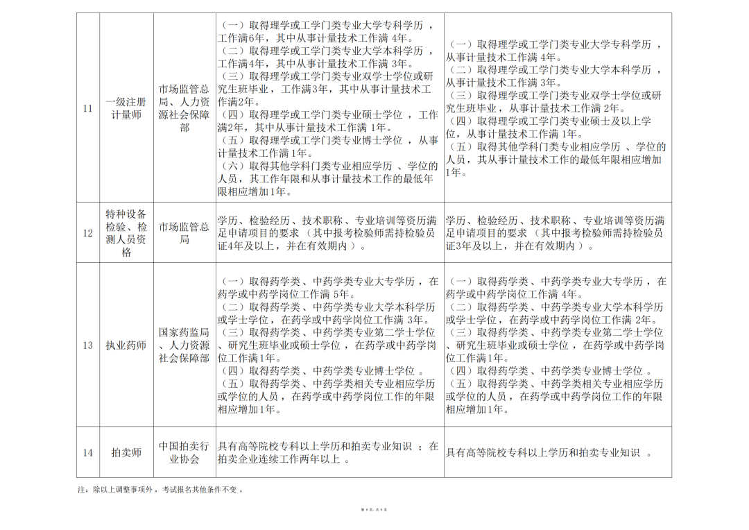 为贯彻落实《政府工作报告》要求,推动降低就业门槛,我部会同国务院有关部门研究制定了部分准入类职业资格考试工作年限调整方案。现予以公示,公示期7天。如有意见建议,请于2021年12月9日之前通过电话、电子邮件等形式反馈人力资源社会保障部专业技术人员管理司。