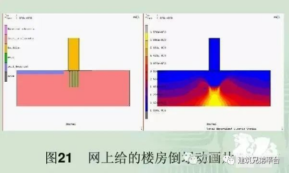 紧贴7号楼北侧,在短时间内堆土过高,最高处达10米左右;与此同时,紧邻7号楼南侧的地下车库基坑正在开挖,开挖深度4.6米,大楼两侧的压力差使土体产生水平位移,过大的水平力超过了桩基的抗侧能力,导致房屋倾倒。