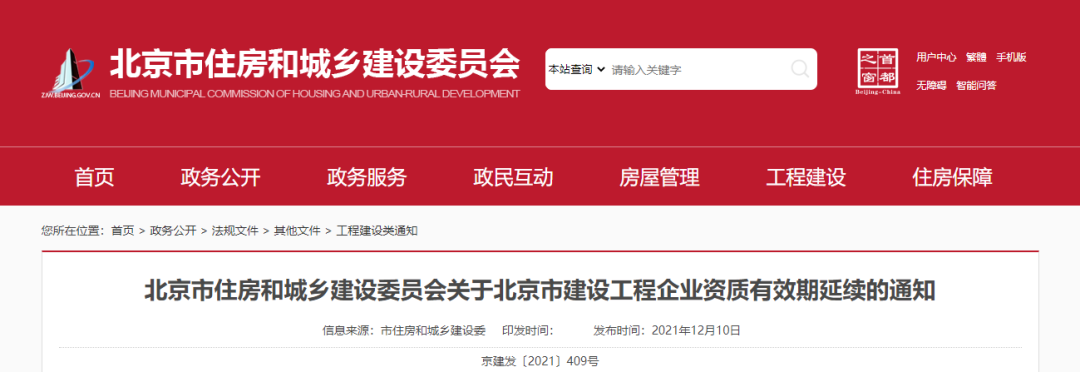 一、市住房城乡建设委核发的建筑业企业、工程监理企业资质,资质证书有效期于2021年12月31日至2022年6月30日届满的,继续延期至2022年6月30日。2021年12月31日后企业可登录市住房城乡建设委官方网站-办事大厅申请下载有效期自动延续后的电子资质证书。