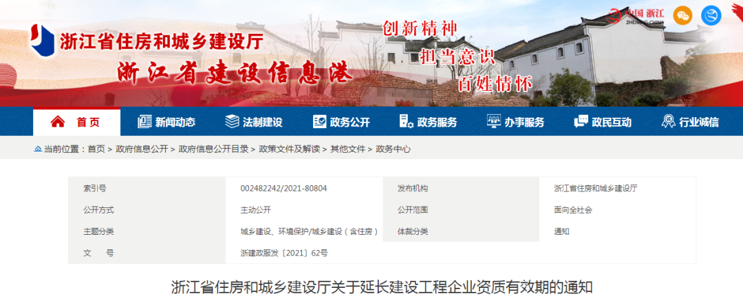 一、我厅核准的工程勘察、工程设计、建筑业、工程监理企业资质和设区市建设部门核准的建筑业企业资质,有效期于2021年12月31日至2022年6月29日期间届满的,统一延至2022年6月30日。即日起至2022年6月30日止,以上范围内的企业无需再申请资质延续。企业可在浙江政务服务网自行下载延期后的电子证书。未取得上述资质电子证书的企业,请于2021年12月31日前申请换发电子证书,具体办理可咨询我厅政务服务中心,电话:0571-85216767。