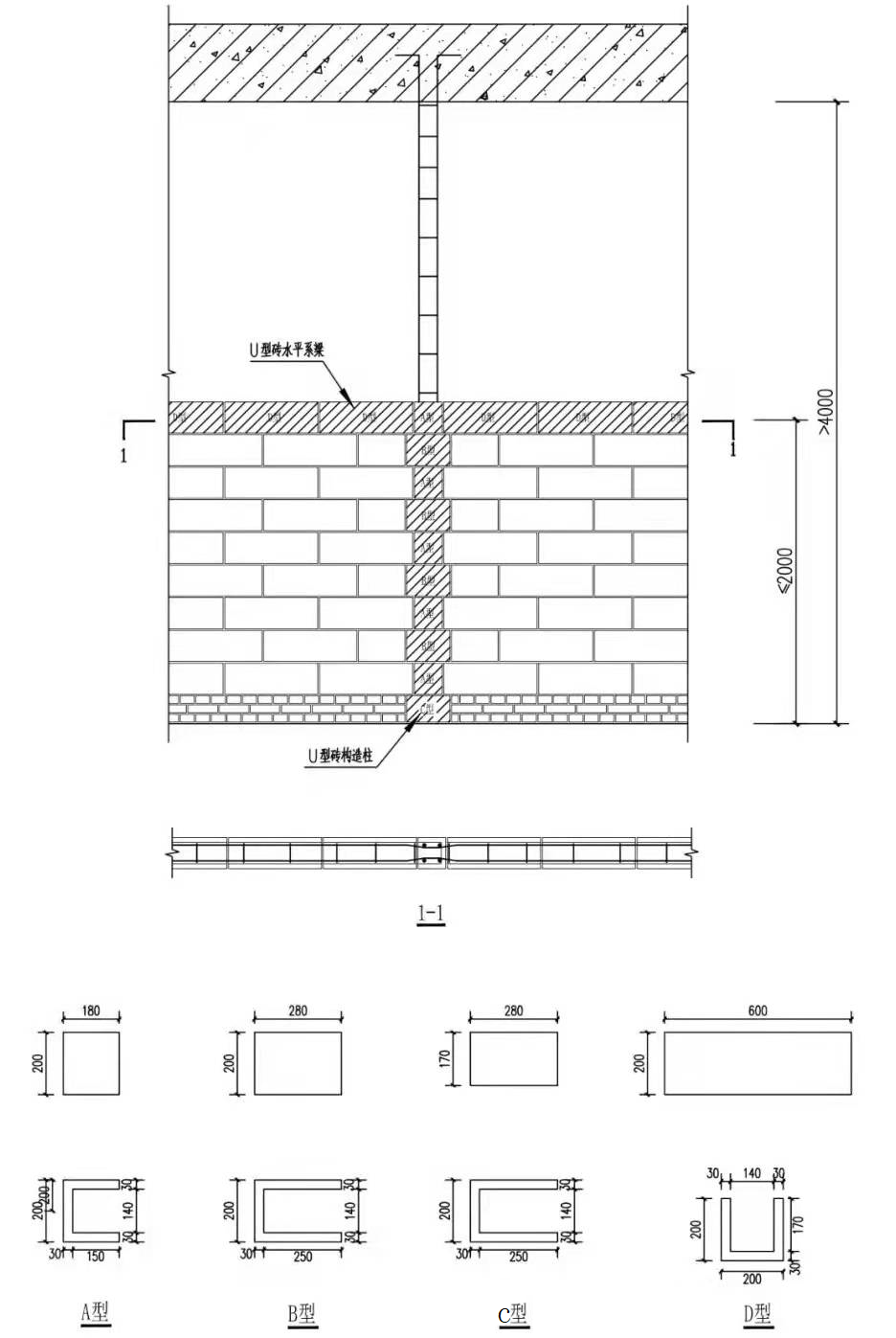 7、若墙体高度大于4m,在砌至2m高度时,在墙上砌筑水平系梁U型构造柱D型砖,砌筑完成后砖内埋设水平系梁钢筋并浇筑混凝土。
