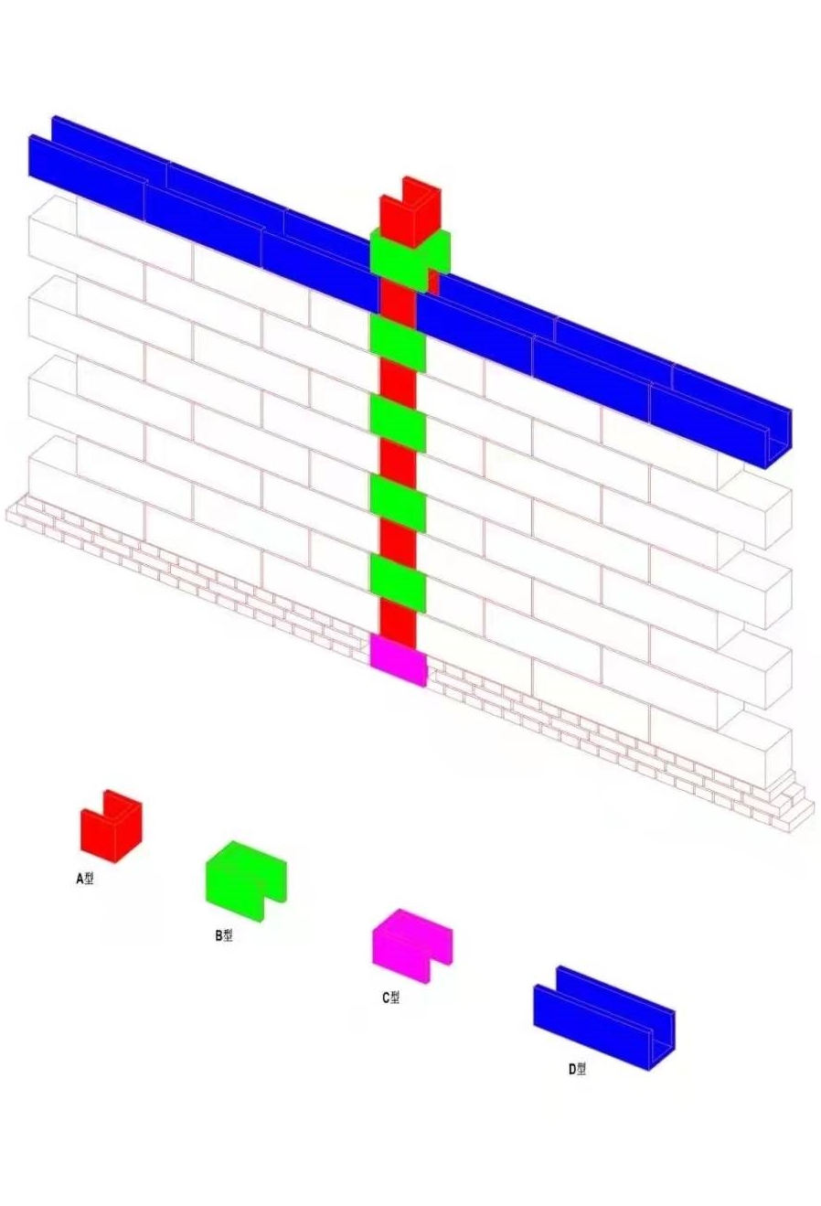 熟悉图纸提前规划→根据相关模数倒制U型砖→构造柱钢筋绑扎→U型砖砌块随墙体同时砌筑→混凝土浇筑。