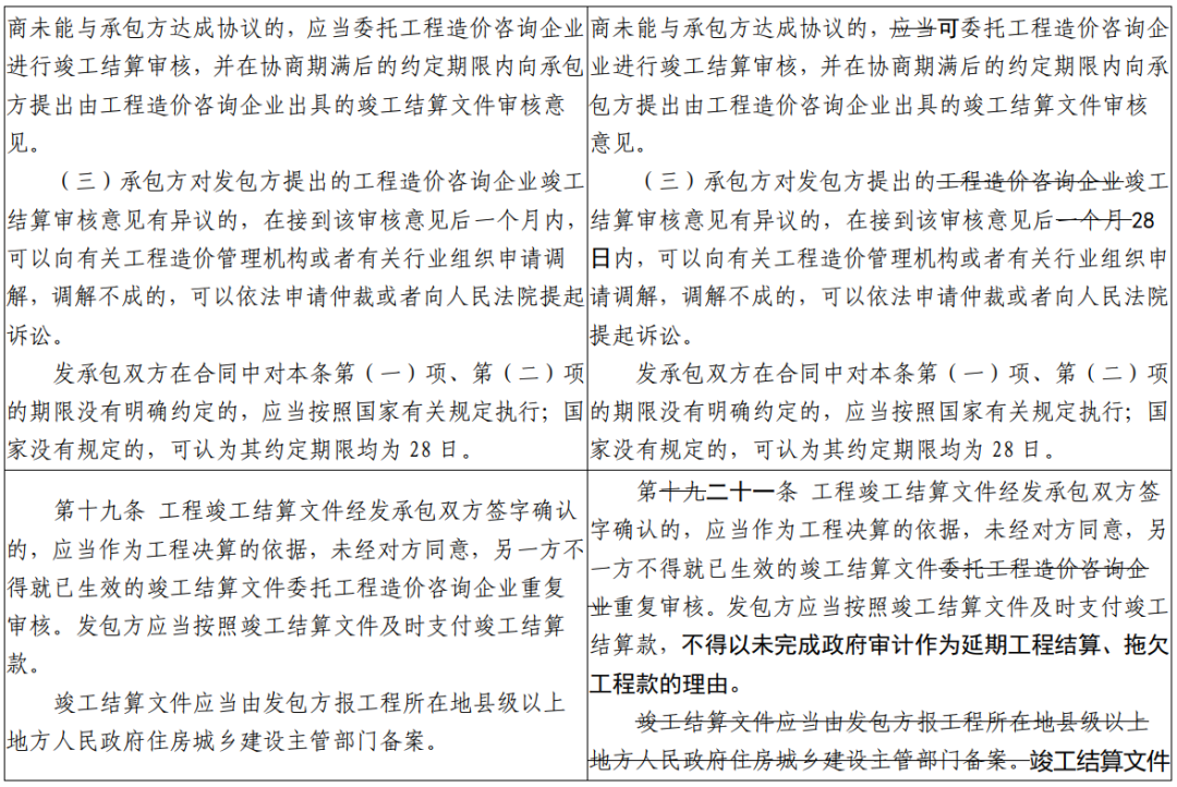 (三)推行建筑工程施工过程结算。为贯彻落实国务院决策部署,进一步做好清理政府部门和国有企业拖欠民营企业中小企业账款工作,增加推行建筑工程施工过程结算的条款。明确过程结算的内容,规定过程结算开展的基本流程和时限要求,提出不得以未完成政府审计作为延期结算理由。