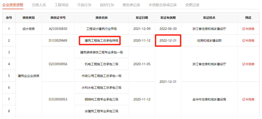 企业资质方面,具有1项设计资质、7项建筑业企业资质。设计资质是工程设计建筑行业甲级,证书有限期至2022年6月30日,发证机关为浙江省住建厅。7项建筑业企业资质中,有1项为建筑工程施工总承包特级资质,证书有限期至2022年12月31日,发证机关为住建部。