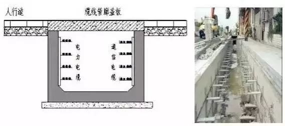 主要负责将市区架空的电力、通讯、有线电视、道路照明等电缆收容至埋地的管道。一般设置在道路的人行道下面,其埋深较浅,一般在1.5米左右。以矩形断面较为常见,一般不要求设置工作通道及照明、通风等设备,仅增设供维修时用的工作手孔即可。