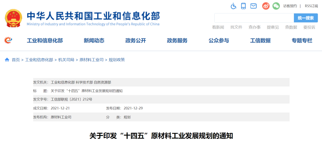 近日,工业和信息化部、科技部、自然资源部等三部委联合发布《“十四五”原材料工业发展规划》。
