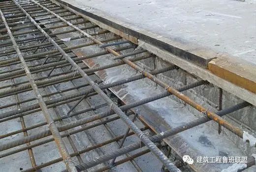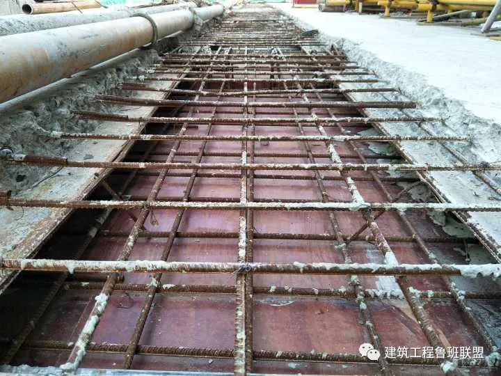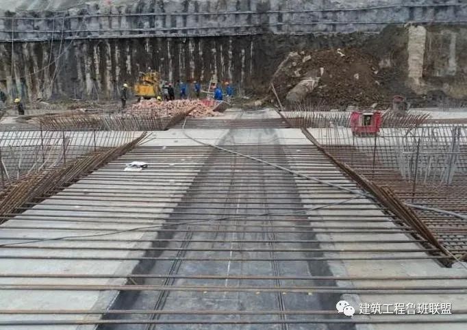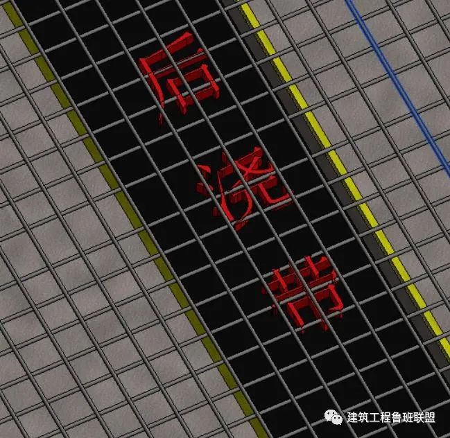 施工要点:在后浇带边线位置面筋上部设置5cm木条挡板,采用扎丝与面筋绑扎固定,避免混凝土进入后浇带内。