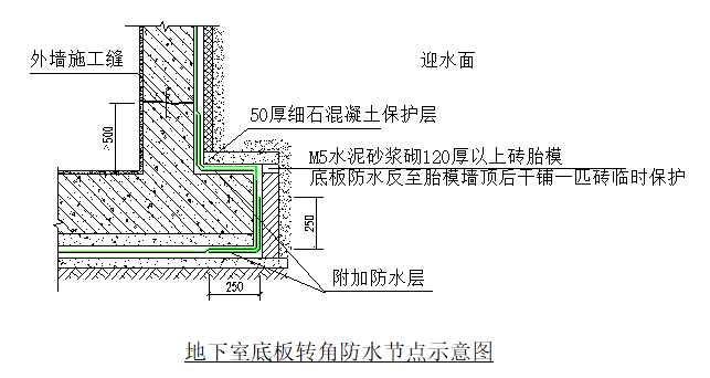 地下室底板转角位置受作业空间、防水需留预接长度、要对防水接头实施保护等影响因素多,为此须重视此转角部位的防水做法。