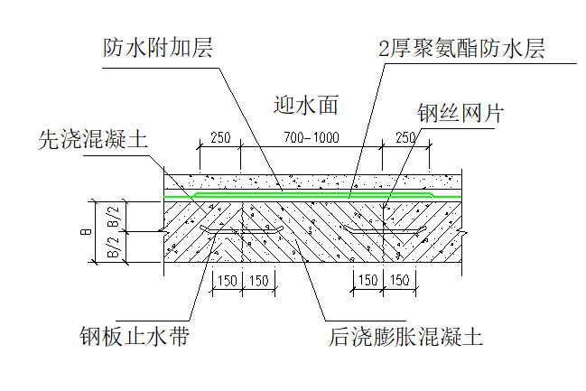 在后浇带两侧设3mm厚300mm宽止水钢板。不同块钢板连接必须满焊。钢板U型口朝向迎水面,在施工缝处安装钢网片。将后浇带两侧混凝土表面的浮浆、松动的石子及松散混凝土剔除,表面凿毛,并浇水湿润24h以上。后浇带选用具有补偿收缩作用的微膨胀混凝土。混凝土应分层浇筑并振捣密实。