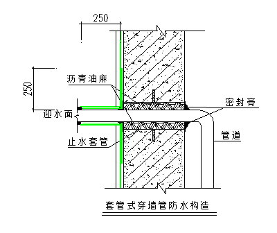 结构变形或管道伸缩量较小时,穿墙管可采用主管直接埋入混凝土内的固定防水做法,主管应加焊止水环,并应在迎水面预留20深、30宽凹槽,凹槽内采用油膏密封材料嵌填密实。穿墙管应在浇筑墙体混凝土时预埋。穿墙管与内墙角、凹凸部位的距离应大于250mm。相邻穿墙管间的间距应大于300 mm。