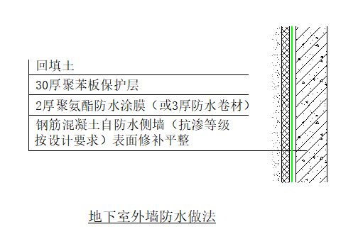 适用地下室外墙内侧为室内(如私家住宅、车库、功能房、架空活动区)的外墙防水做法。
