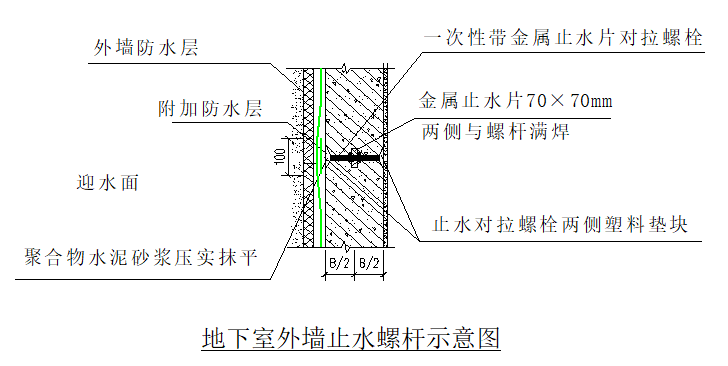 地下室外墙用于固定模板的螺栓必须采用一次性止水对拉螺杆。一次性止水对拉螺杆可采用工具式螺栓或螺栓加塑料堵头方式使螺杆端头留出凹槽。螺栓上应加焊2厚70×70mm止水片。当一次性穿墙螺杆两端采用锥形塑料垫块时,养护结束后需在墙体内外逐个剔除塑料垫块,然后将螺杆从孔口的最深处割断。在施工防水层前,应逐个将螺杆位置处的凹槽用1:2聚合物水泥砂浆压实抹平。