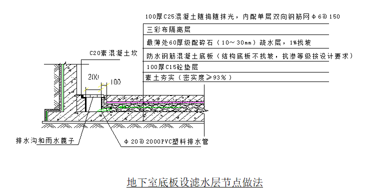 采用粒径10~30碎石滤水层,最薄处60厚,滤水层1%找坡,坡向排水明沟,排水明沟坡向集水井。沿排水沟边设100(宽)X100(高)C20素混凝土坎。