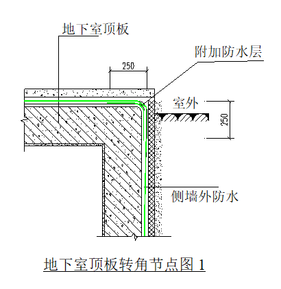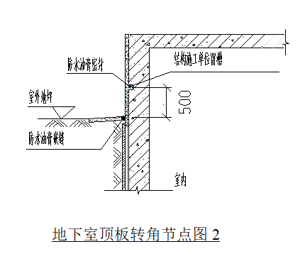 当地下室板顶与室外地坪高差在1米以内时,采用图1节点在转角处施工防水附加层后,在外墙与顶板处满做防水层。当地下室板顶高于室外地坪1米以上时,可按图2做法在外墙结构处留槽,将防水层在槽内收口。
