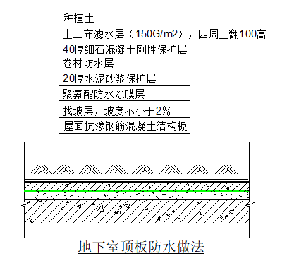 钢筋混凝土自防水结构顶板——找平层/找坡层——聚氨酯防水层——闭水试验——防水保护层——卷材防水层——刚性保护层——滤水层——种植土