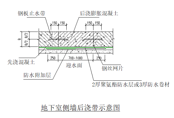 在后浇带两侧设3mm厚300mm宽止水钢板。不同块钢板连接必须满焊。钢板U型口朝向迎水面。隐蔽验收后浇顶板混凝土。