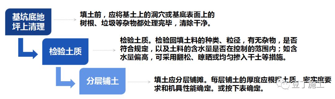 基坑底地坪上清理 → 检验土质 → 分层铺土 → 分层碾压密实 → 检验密实度 → 修整找平验收