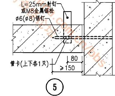4)隔墙板转角或T型连接应用φ6销钉固定。销钉位置宜距隔墙顶和底各300~400。销钉间距为700左右。销钉锚入两块不同方向板材的总深度不得小于一块板厚再加150mm。