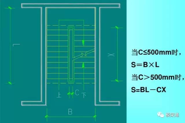 现浇混凝土的模板工程量,除另有规定外,均应按混凝土与模板的接触面积,以平方米计算,不扣除柱与梁、梁与梁连接重叠部分的面积。 S=楼梯各层的水平投影面积之和(梯井宽≤500mm时) S=楼梯各层的水平投影面积之和一各层梯井所占面积(梯井宽>500mm时) 楼梯包括休息平台、梁、斜梁及楼梯与楼板的连接梁,按设计图示尺寸以水平投影面积计算,不口才宽度小于500mm的楼梯井所占面积,楼梯的踏步板、平台梁等侧面模板不另计算。 1.楼梯的踏步、踏步板、平台梁等侧面模板不另计算。 2.水平投影面积包括:休息平台、平台梁、斜梁及链接楼梯与楼板的梁。在此范围内的构件,不再单独计算;此范围以外,应另列项目单独计算。 S=外挑部分尺寸的水平投影面积(挑出墙外的牛腿梁及半边模板不另计算。) 挑檐的支模位置有三处:挑檐板底、挑檐立板两侧,这三处因位置不同、支模长度不相等,另分别计算。 S=台阶水平投影面积